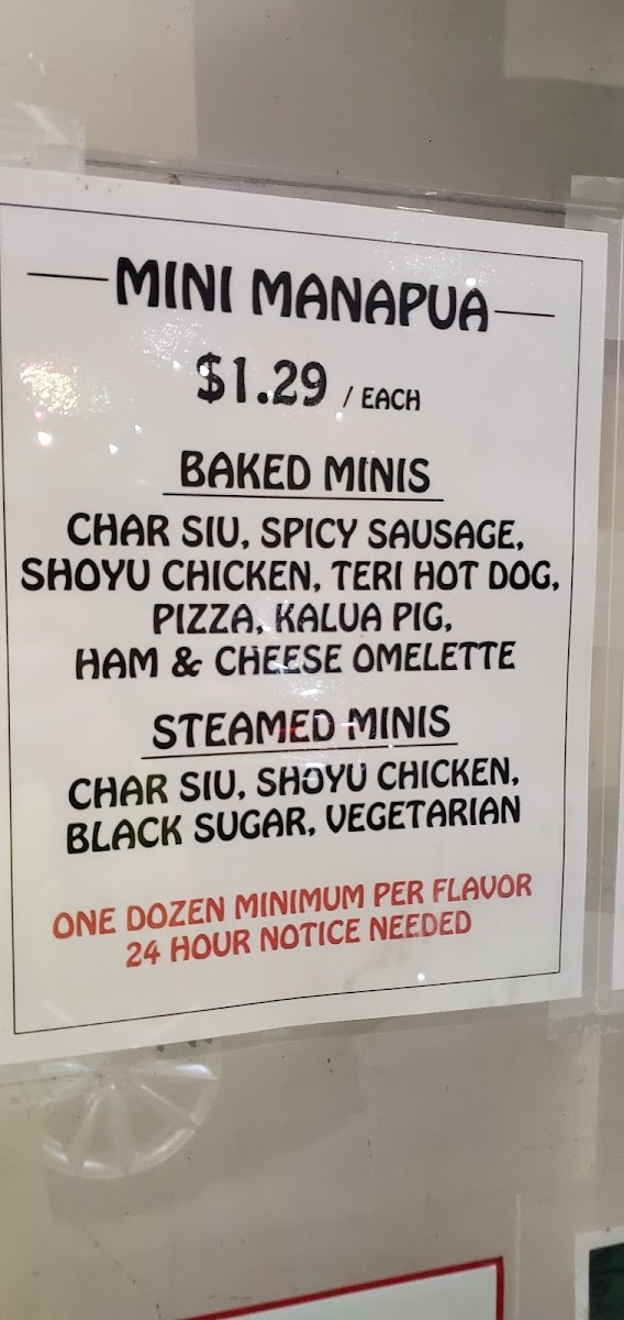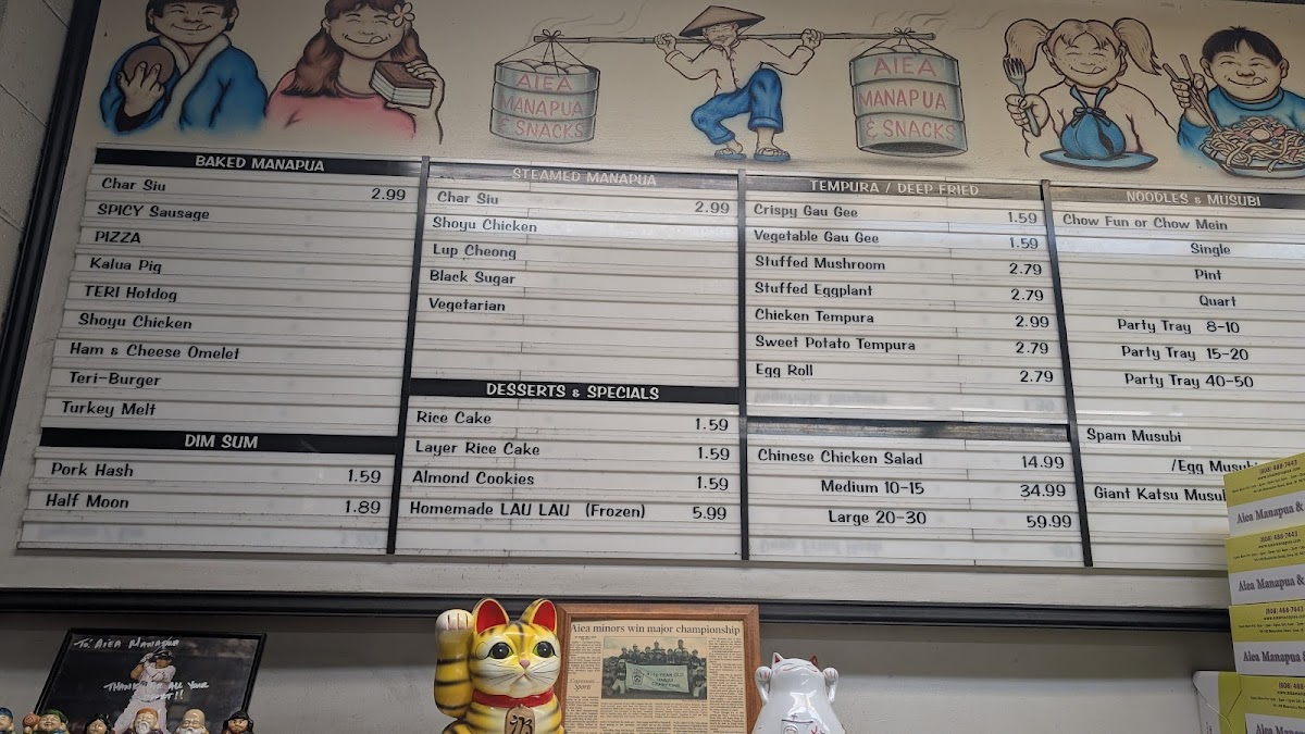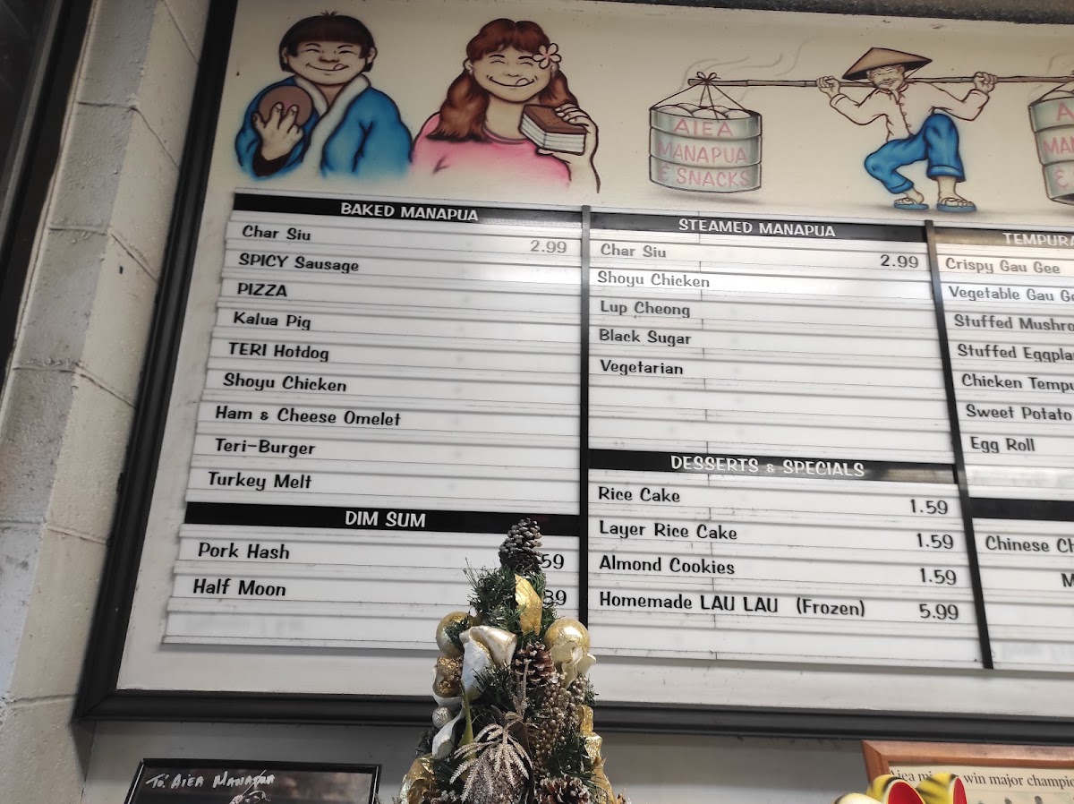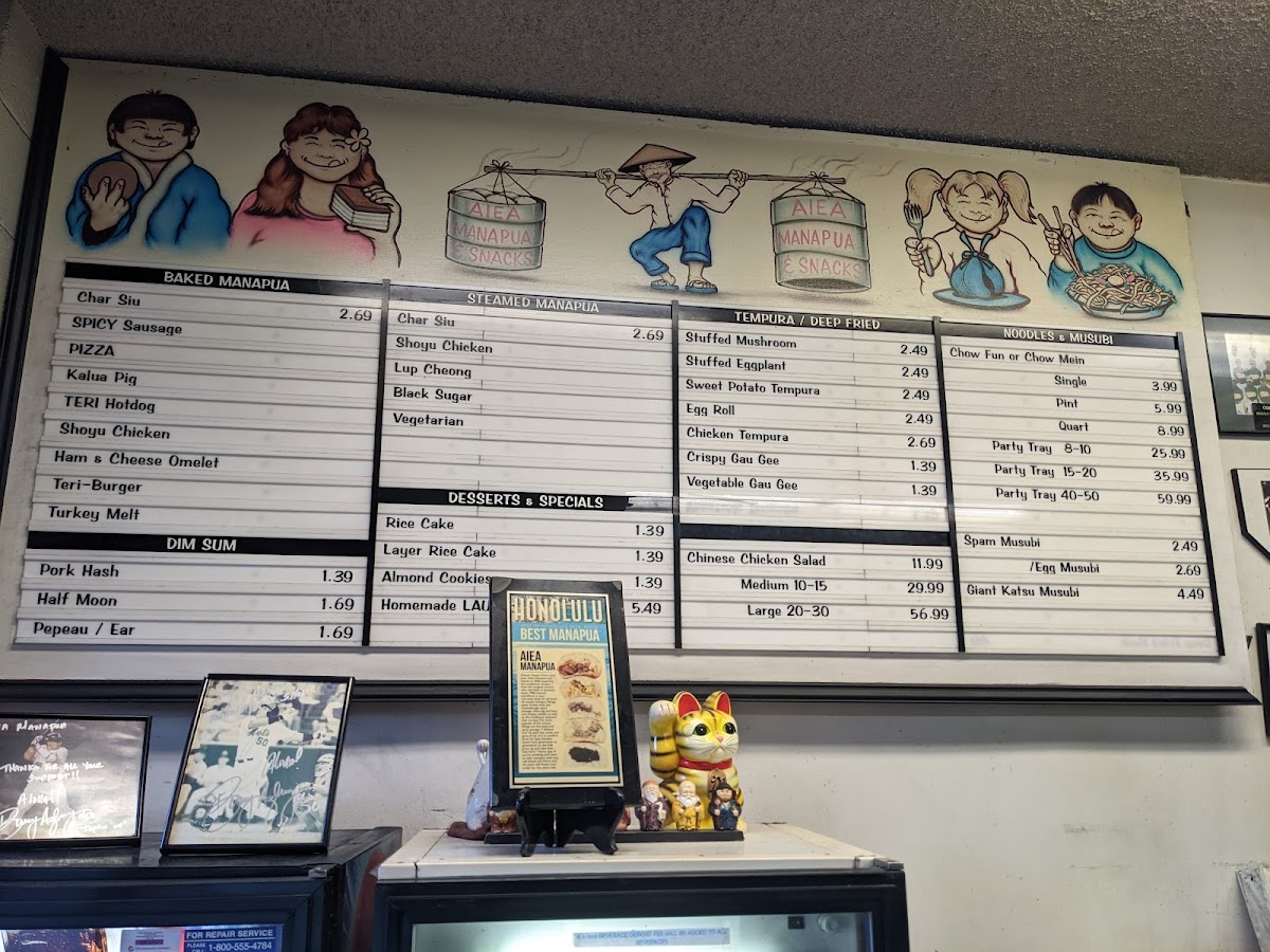 At Aiea Manapua & Snacks, you'll find a delightful variety of traditional Hawaiian snacks and freshly made manapua. From the moment you step into the restaurant, the aroma of warm, fluffy manapua fills the air, inviting you to experience the island's flavors in every bite. Whether you're craving a sweet, savory, or hearty snack, the menu has something for everyone. The Aiea Manapua & Snacks Menu offers a mix of local favorites like char siu manapua, spam musubi, and other ono (delicious) treats, each crafted with care and packed with authentic taste. Pair your meal with refreshing drinks, or indulge in a sweet treat to round off your experience. The menu is simple yet full of variety, perfect for a quick bite or a leisurely meal.