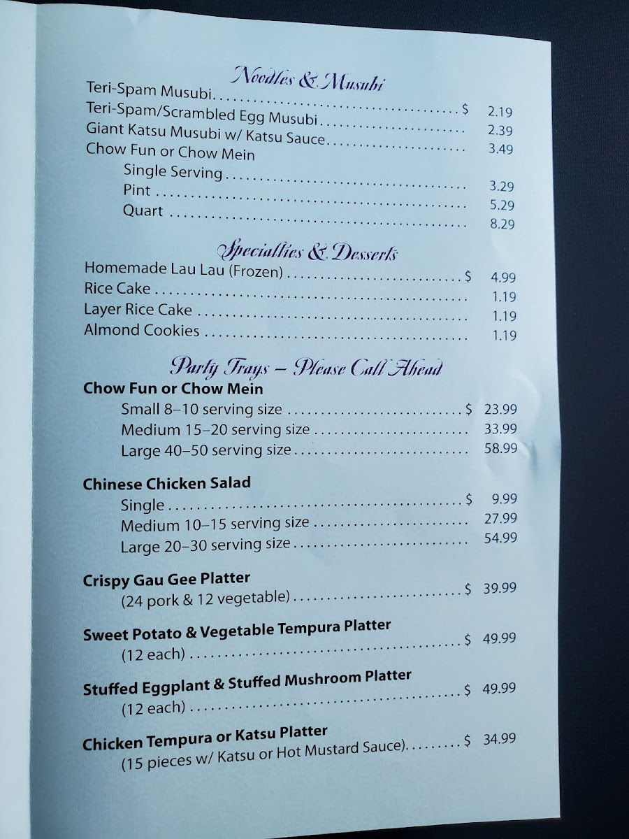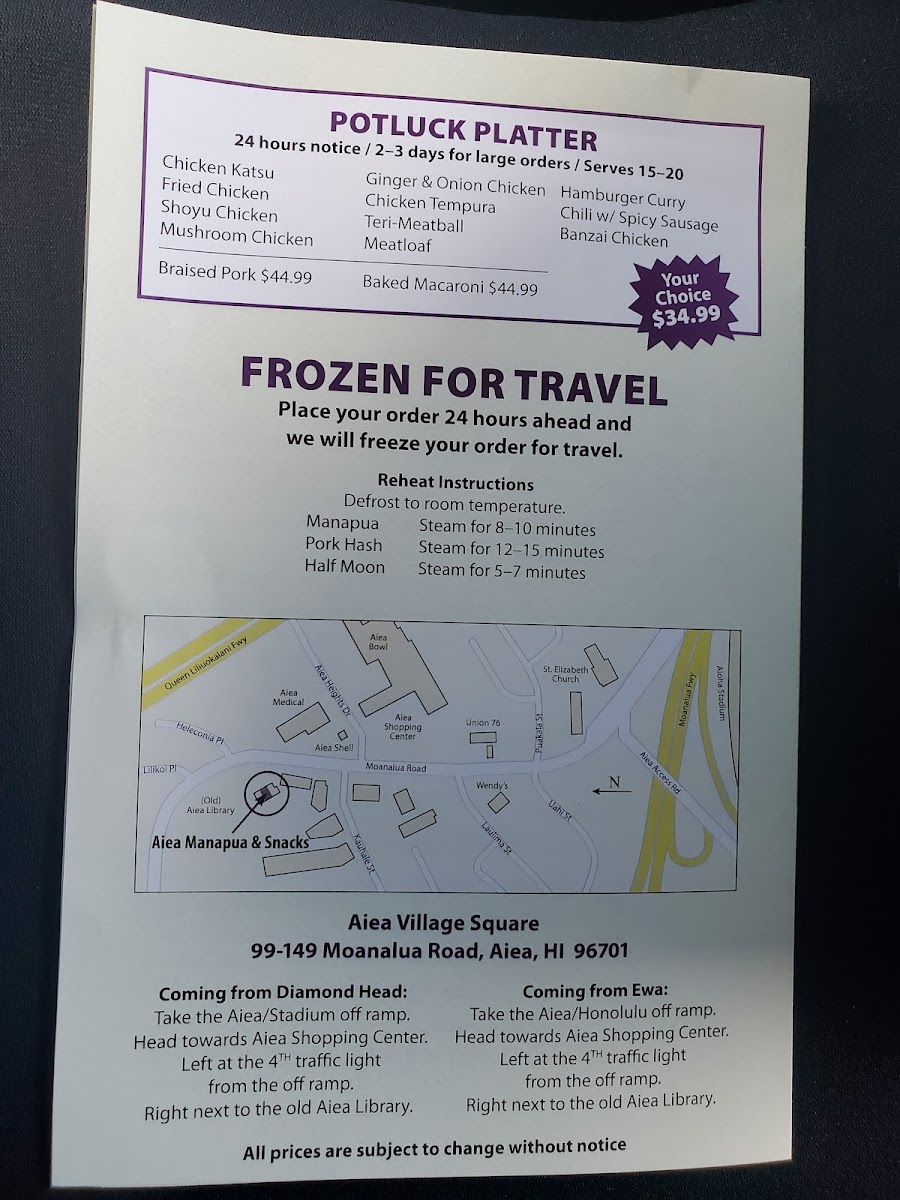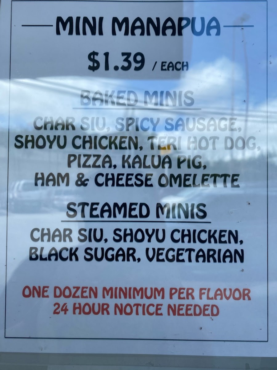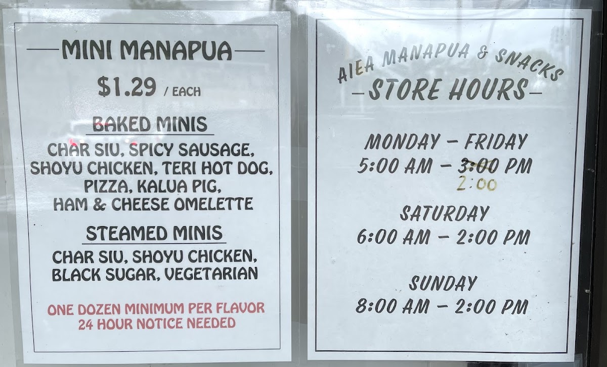 At Aiea Manapua & Snacks, you'll find a delightful variety of traditional Hawaiian snacks and freshly made manapua. From the moment you step into the restaurant, the aroma of warm, fluffy manapua fills the air, inviting you to experience the island's flavors in every bite. Whether you're craving a sweet, savory, or hearty snack, the menu has something for everyone. The Aiea Manapua & Snacks Menu offers a mix of local favorites like char siu manapua, spam musubi, and other ono (delicious) treats, each crafted with care and packed with authentic taste. Pair your meal with refreshing drinks, or indulge in a sweet treat to round off your experience. The menu is simple yet full of variety, perfect for a quick bite or a leisurely meal.